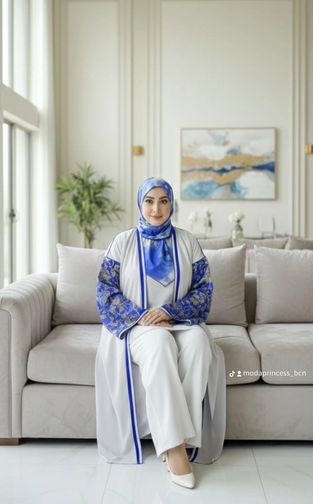 Abaya blanca con detalles en azul intenso y mangas bordadas, ideal para un look elegante y distintivo.