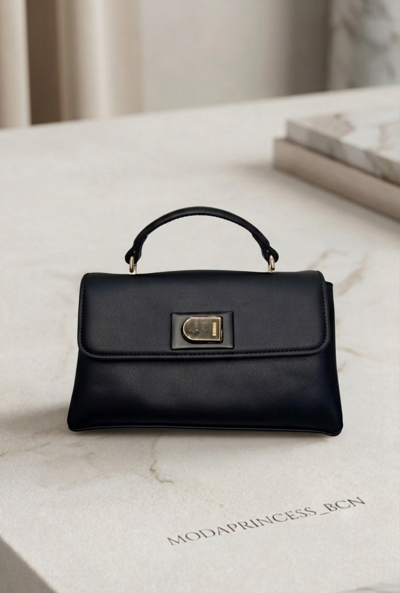 Bolso negro de diseño minimalista con cierre metálico, perfecto para elevar cualquier outfit.