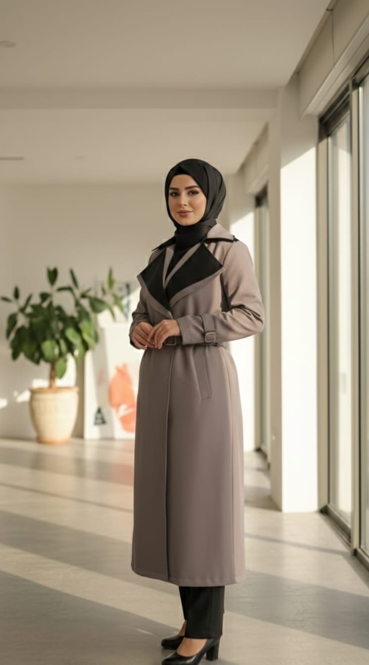 Gabardina en tono taupe con corte moderno, perfecta para un estilo urbano y elegante.